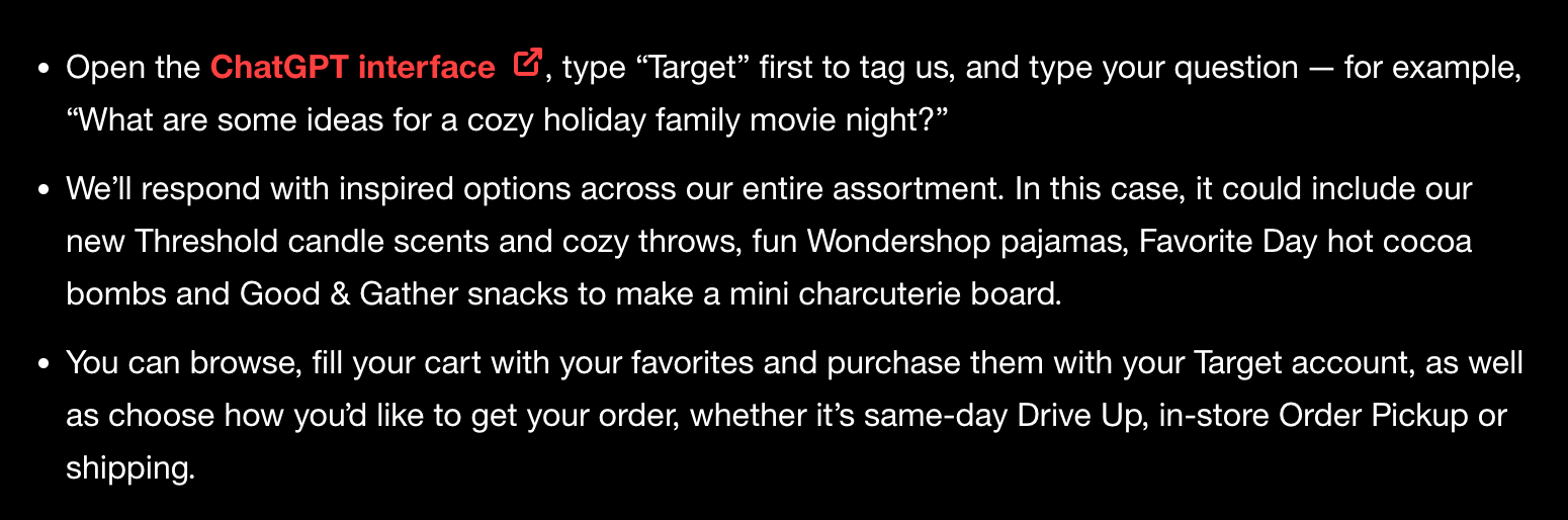 In November 2025, Target partnered with OpenAI to launch a shopping experience inside ChatGPT. Customers can tag Target and ask for ideas: